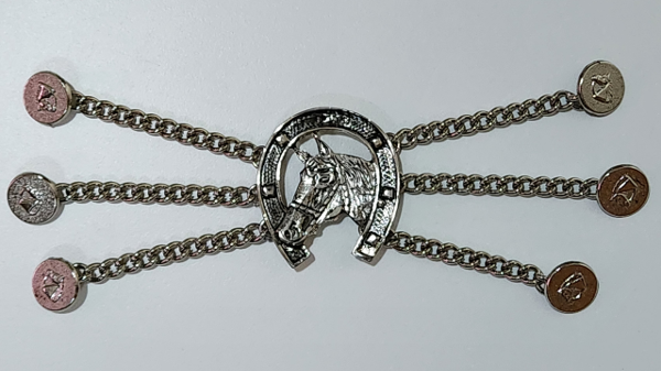 Rastra Mediana Herradura y caballo niquelada.Medida del centro 5 cm de ancho x 5,5 cm de alto.Medida extendida 23cm.